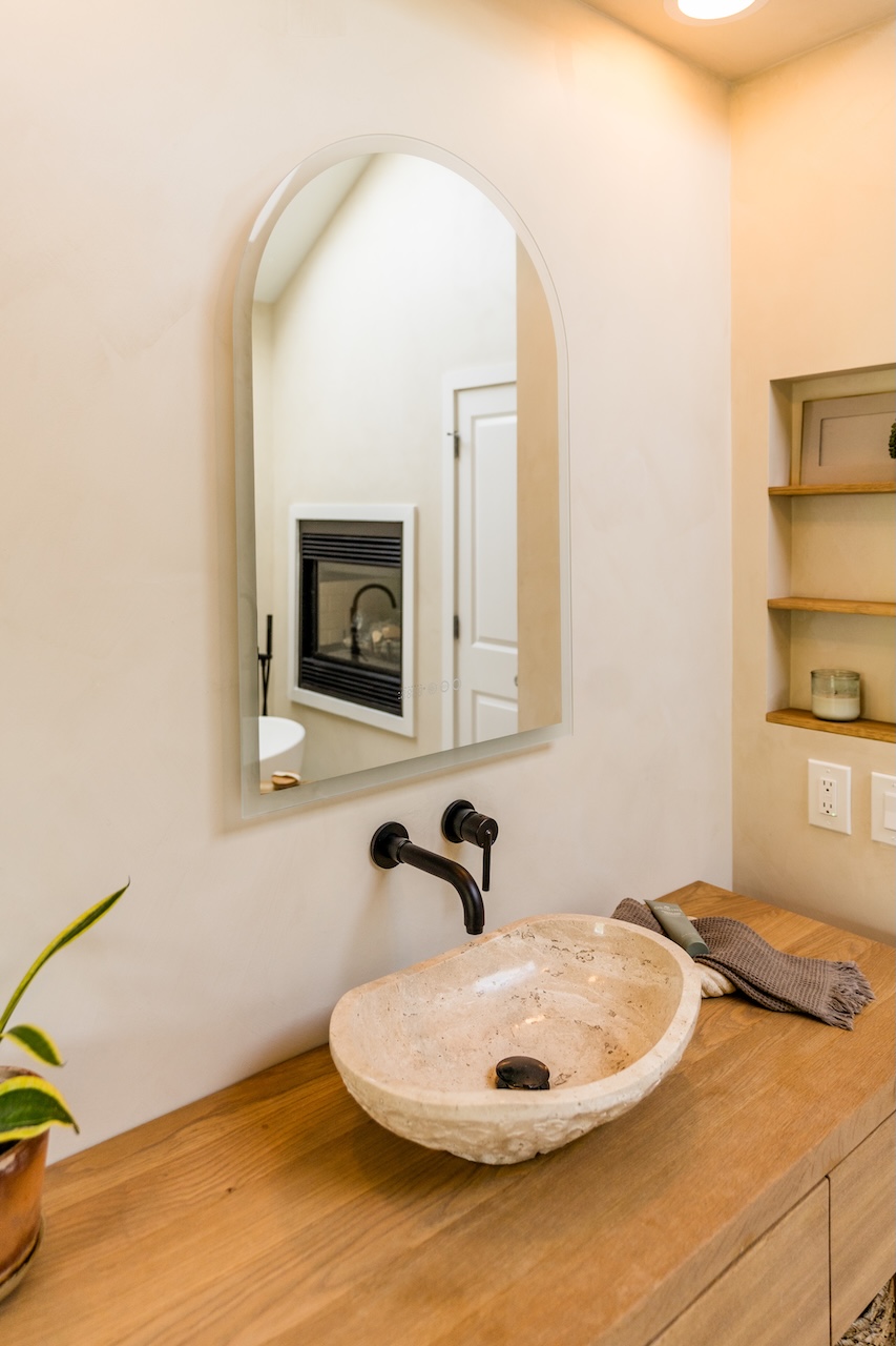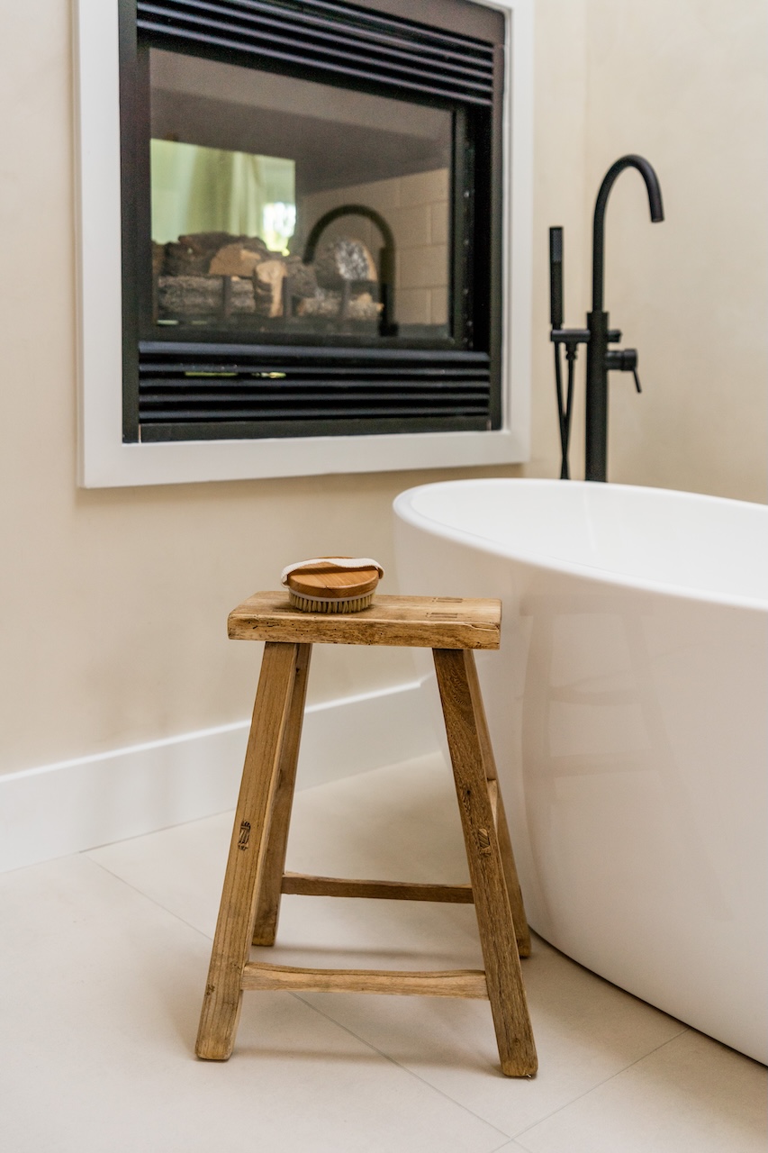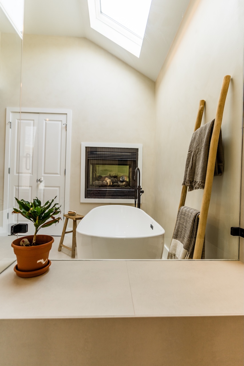 - Recessed fireplace positioned at the foot of the tub, creating a spa-like focal point