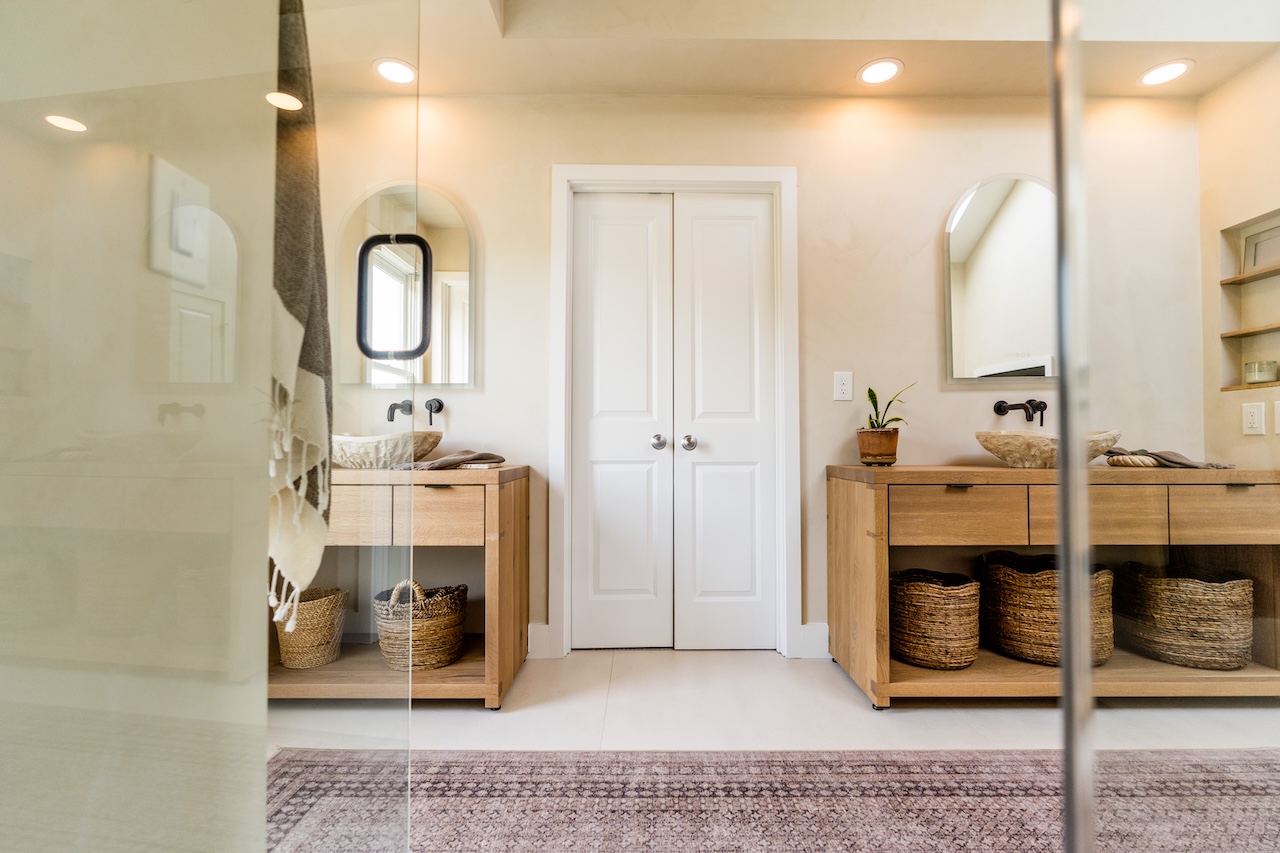 - Natural wood freestanding vanities adding warmth and organic contrast