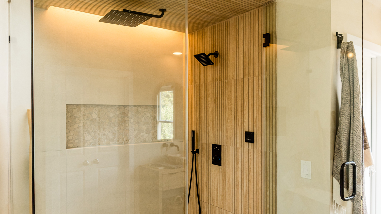 The mix of textures, lighting, and finishes creates a shower that feels refined yet organic.