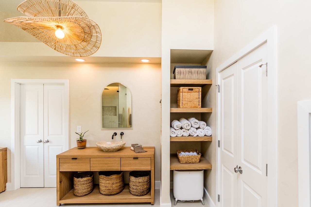 The vanity design reinforces the balance between modern simplicity and warmth: