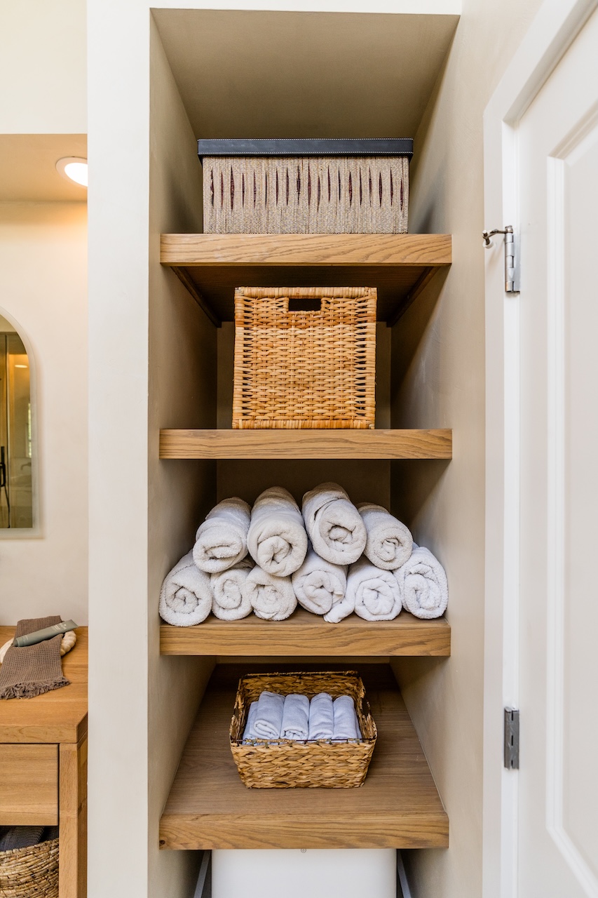 To maintain the bathroom’s streamlined appearance while maximizing functionality, we incorporated: